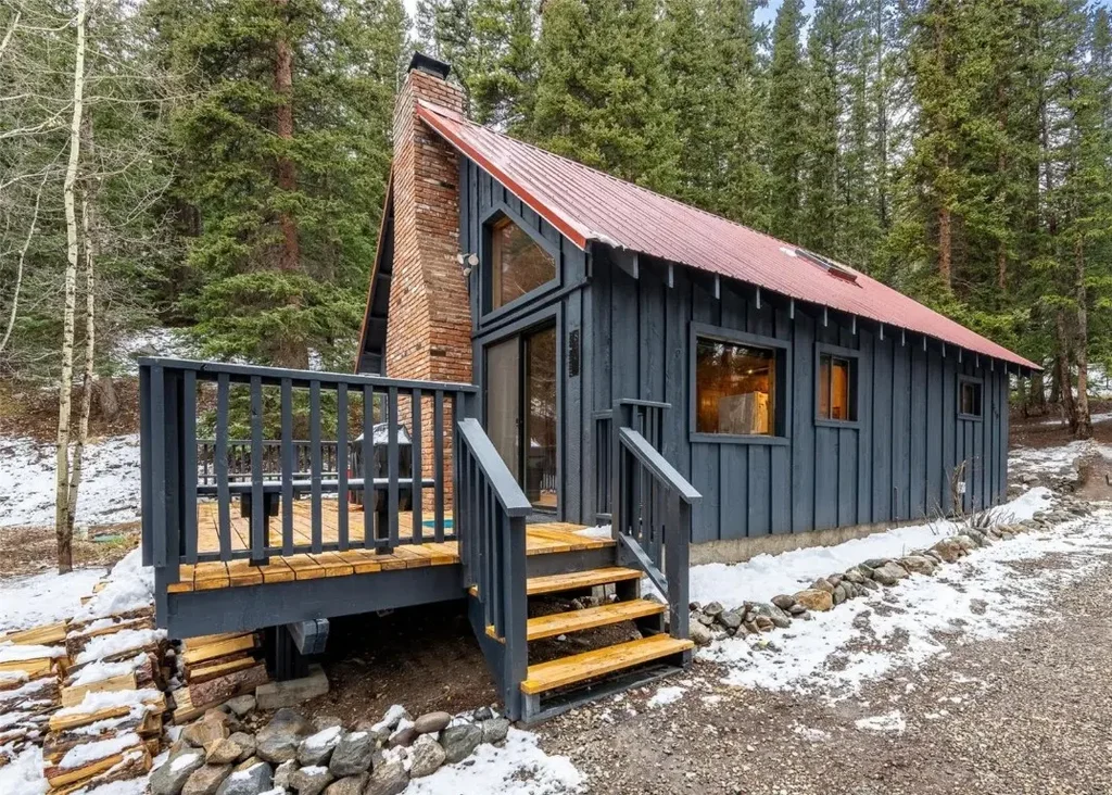 Get ready to fall in love with your dream cabin! This stylish retreat features brand-new luxury vinyl plank flooring and cozy textured carpet that feels like a hug. Fresh, modern paint colors set the vibe, while a jaw-dropping round light fixture hangs from the vaulted ceiling, making a bold statement. This isn’t just a cabin; it’s a modern getaway waiting for you! Rejuvenated with a chic blue-black stain called 'After Midnight,' the cabin blends a sleek, modern edge with rustic charm. Over ten trees have been removed to welcome in sunshine, creating a vibrant atmosphere that instantly feels like home. Imagine sipping your morning coffee on the spacious deck, firing up the grill for epic barbecues, or relaxing as the sun sets, all while local wildlife strolls by. Inside, natural light floods the open living room and kitchen, thanks to massive picture windows that bring the outdoors in. The vaulted ceilings, with cool wood beams and tongue-and-groove panels, wrap you in warmth and style. This is the ultimate hangout! The main-level primary bedroom offers convenient access to the laundry and bathroom. Head upstairs to find a cozy loft that doubles as a second bedroom—your perfect hideaway for peaceful moments. Ideal for cozy nights in or catching some Zs away from it all! Tucked away on a spacious .77-acre lot, this property gives you plenty of room for your adventures. Don’t miss the cute 'mini cabin' outside—a modern touch perfect for stashing your outdoor gear. Whether you’re looking for a personal retreat or a spot with rental potential, this cabin checks all the boxes. Just a quick drive to Breckenridge, it’s your chance to embrace cozy interiors and serene surroundings, making every moment feel like you’re living the ultimate modern mountain dream!