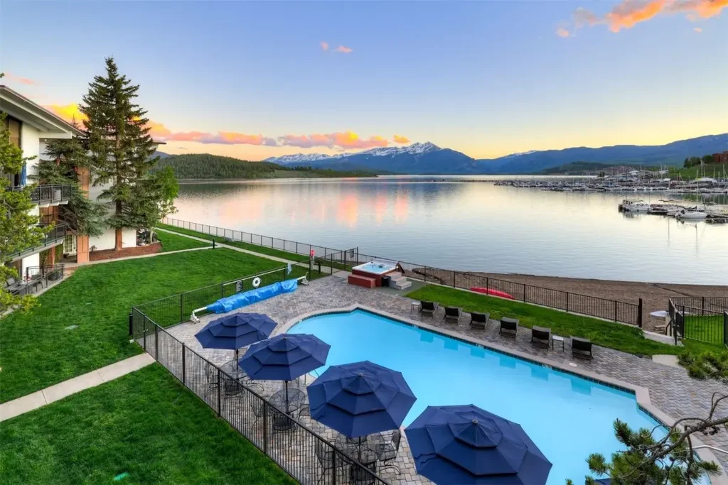 Enjoy lakefront relaxation at this top-floor Lake Dillon waterfront retreat. Enhance your morning coffees and evening meals with views of snow-capped peaks over the water, and treat yourself to summer paddle-boarding and kayaking access steps from the front door. Take a dip in the heated outdoor pool, and watch the sunset from the lakefront hot tub. This spacious, two-level condo is brightly lit floor-to-ceiling, with double and triple-paned multi-story windows for noise and sun exposure reduction. All four bedrooms feature a dedicated bathroom. A multi-use lofted area overlooks the large great room, and an open kitchen/living space makes cooking and socializing easy. Multiple pantries offer storage for all appliances, and locking interior and exterior owners closets offer space for ski gear, bikes, water sports equipment, and more! A professionally managed HOA offers ease for homeowners with on-site maintenance, snow removal, parking, trash & recycling collection, common area and amenity maintenance, and general landscaping. Dues include heat! Located in the town of Dillon, this condo allows for short-term rentability, in accordance with HOA guidelines. Summer and winter activities galore: walk to concerts at the Dillon Amphitheater, fish and boat all summer long at the Dillon Marina, bike along the paved recreation path, golf at five nearby mountain courses, or have fun in the snow at 5 world-class ski resorts all within a 10-30 minute drive.