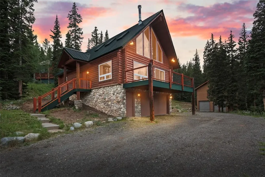 This is the quintessential log cabin in the woods. Located on a half-acre lot with mature Spruce trees and views of Red Mountain. This home is only minutes from downtown Breckenridge and the Breckenridge ski area. 3 bedrooms and 2 baths, T & G Precision log construction, a 2-car garage and an additional 1744 square foot garage/workshop/ toy storage space with an office/storage room above. The roof and sky light are new, the exterior and interior have been painted and stained. New railing on the front porch. The neighborhood is welcoming and friendly with many locals living in the area. One owner/builder of this cozy, warm, comfortable and affordable log home. Snowmobiling, hiking and biking trails close by. This is the perfect mountain getaway or permanent home for your family and pets.