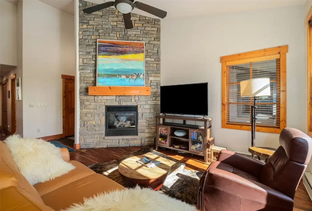 This top floor, corner unit at Sundance Creek welcomes you with high ceilings and abundant natural light. The acacia floors, updated cabinetry and floor to ceiling stone fireplace, give the home warmth and coziness, and a private deck off the dining space offers stunning views to Emerald Mountain and the ski area. As you walk down the hallway, you find the well-appointed full guest bathroom, a large storage closet as well as a utility/laundry space. The guest bedroom offers plentiful storage and light as well. Across the hallway you find the spacious primary bedroom with ensuite bathroom. Sundance Creek is within walking distance to shops, restaurants, Starbucks, the Core Trail and free bus stop. Enjoy everything Steamboat has to offer from a convenient location between Steamboat Ski Resort and downtown. The HOA takes care of exterior maintenance, snow removal, landscaping and a large hot tub. With your own finished garage with plenty of space for a vehicle and your toys, this beautifully updated home is not to be missed!