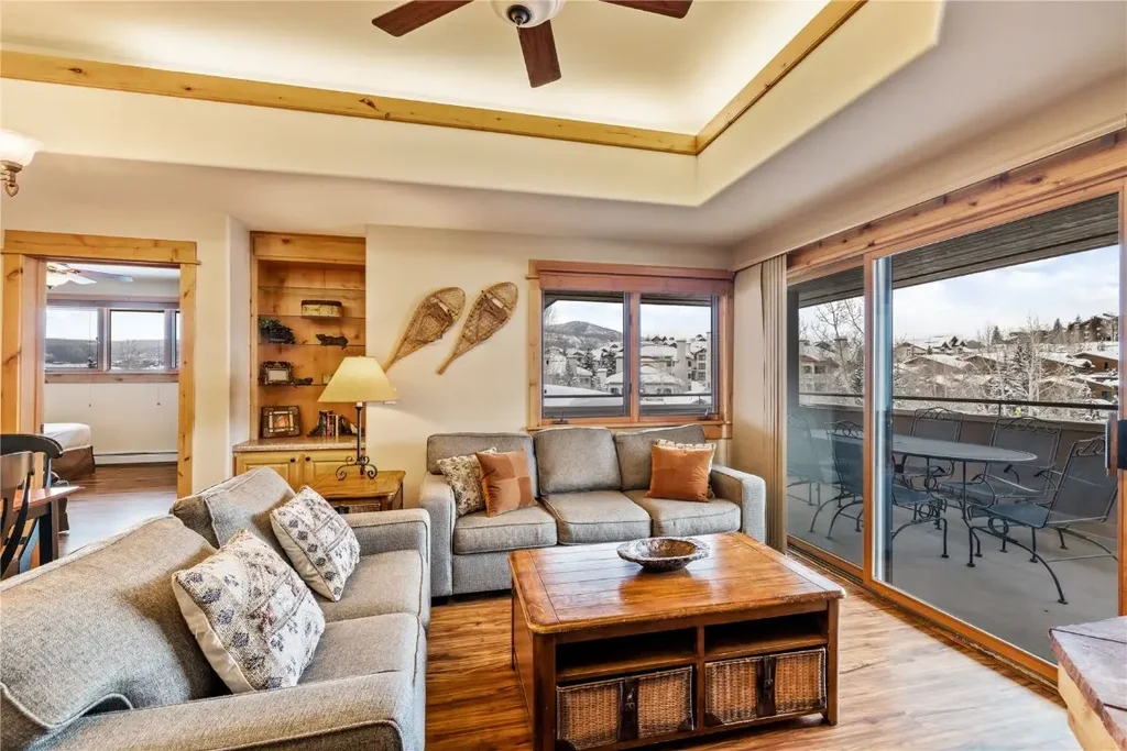 Experience mountain living at its finest in this updated top-floor corner Canyon Creek condo. With views of the ski area from the wraparound private deck, this is an ideal retreat for families or groups of friends. Strategically situated in the heart of the action and just a short stroll from the revitalized base area of the Steamboat Ski Resort. As you enter the condo, the foyer area has a spacious closet for jackets and gear and seating to take off snowy boots. Beyond the entrance, you’ll find a beautiful chef's kitchen with granite countertops and recently upgraded stainless steel appliances. Enjoy the warm fireplace that beckons you into the living area, furnished with a sofa and lounge and offering views of the ski area. The expansive private deck off the living room offers a seamless transition to indoor/outdoor living, and is a perfect spot to grill some food or sip your morning coffee while soaking in the panoramic views of the ski area. With each bedroom featuring an en-suite bathroom, ceiling fan, TV and multiple storage closets throughout, this is a perfect property for large groups and offers privacy for everyone. The primary suite has a king bed, private fireplace and en-suite bath adorned with granite countertops and double sinks. The additional bedrooms include a guest suite with queen bed and en-suite bath while the third bedroom is designed for versatility, currently featuring 2 twin beds but could easily fit a queen size bed. Sit poolside during the summer months or hit the hot-tub after a full day of skiing. There is a 24 hr fitness center on site, large ski lockers that provide a secure spot for your equipment, and an on-call shuttle offering flexibility to get around town throughout the winter. This condo offers great rental income potential and comes fully furnished and turn-key with the added convenience of reserved parking in the heated underground garage with elevator access. Come embrace the mountain lifestyle!