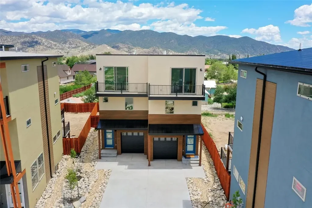 One of the lowest priced townhomes in Salida!! West End a community of homes perfectly located minutes from the Arkansas River and historic downtown Salida. Embrace the Colorado lifestyle surrounded by gold-medal fly fishing, whitewater, mountain biking, and annual festivals & events. Boasting a modern mountain aesthetic, this 1,501 sq. ft. three-story condo with 3 bedrooms, 3.5 bathrooms -offers breathtaking mountain views from every window. Step inside to discover a stylish retreat with luxurious fixtures & finishes throughout. The first floor features an attached garage and sunlit entryway that leads into a private bedroom (non-conforming could also be used as bonus room/office) with its own private bathroom, offering versatility and convenience – use it to fit your needs best! The second floor is where you will find a spacious great room that includes living, dining, and kitchen. The electric fireplace, chic lighting, and luxury vinyl plank flooring sets the ambiance, creating a cozy atmosphere that's perfect for relaxation. An open floor plan seamlessly connects the great room to the kitchen, complete with a pantry and half bathroom. The kitchen features LG stainless appliances, tile backsplash, and large Quartz counters with eat-in bar space. The balcony off the great room is perfect for outdoor entertaining with stairs leading down to the backyard. On the third floor, you'll find the primary bedroom with a lovely custom-tiled en-suite bathroom and views of S Mountain. The guest bedroom features a sliding glass door to its own private balcony with beautiful views of the mountains and another custom-tiled bathroom. Don't miss your opportunity to experience the best of Salida living.