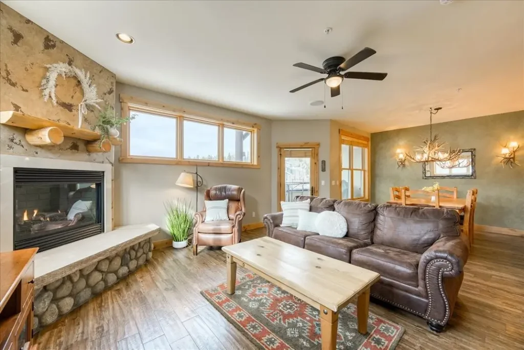 Discover the perfect mountain retreat in this beautifully finished end-corner unit condo with breathtaking mountain views! This 2-bedroom, 2-bath gem offers a bright and spacious living room with tall ceilings that flood the space with natural light. Enjoy the warmth of a cozy fireplace and the charm of a rustic mountain feel throughout. The large bedrooms provide comfort and relaxation, while the private balcony is ideal for taking in the crisp mountain air. Conveniently located within walking distance to downtown Breckenridge and just a short walk or bus ride to the base of the ski area, you’ll have supreme access to all the town has to offer. After a day of adventure, unwind in the hot tub or take advantage of the fitness room, game room, and lounge area. The condo also includes an oversized, heated garage — a rare and valuable perk. Situated in sought-after Zone 1, this property allows for an unrestricted short-term rental license, offering excellent income potential. Experience year-round recreation with easy access to ski lifts in the winter and hiking trails in the summer. Don’t miss this opportunity to own a piece of Breckenridge charm!