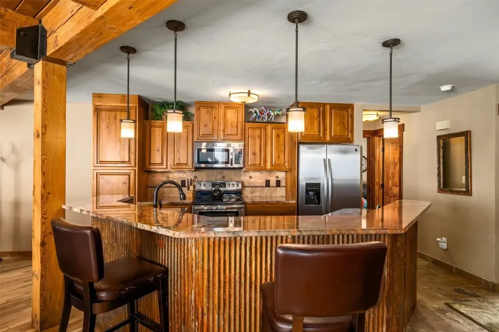 All you need are your toys and clothes to immediately feel at home in this 2 bedroom fully furnished and turnkey Lodge condo. Not only can you walk to ski, but Wild Plum Market and Apres Ski Bistro are just steps from the condo for easy access to beverages and food. No renovations needed, as this condo has been beautifully updated including solid granite counters, new cabinets, hardwood flooring in the kitchen, dining, and living room, new lighting, and custom tile in the showers and floors in the bathrooms. The mountain rustic vibe gives it the authentic Steamboat feel featuring weathered corrugated steel wainscot in the entry and along the kitchen bar seating, slate tile floors in the entry and kitchen, a barn door in the primary bedroom creating privacy for the bathroom, sandblasted beams and wood ceiling in the great room, and a cozy gas log fireplace for chilly evenings. What really sets this condo apart from the other Lodge condos is the removal of the post/storage closet at the entry to the kitchen. It opens up the whole room, and due to the addition of an extra pantry closet with pullout drawers, you actually gain storage space! The location of this condo is perfectly situated for quick access to the slopes - just walk across the parking lot and Apres Ski Way and take the path to the gondola - you're there in 5 minutes! The shuttle is also an option, making it easier with little ones with skis, poles, etc. No need to haul your skis/boards up stairs, as this is located on the ground level around the corner from the pool and hot tub, so your personal ski locker is right outside your door. If you're looking to supplement carrying costs, the amenities at the Lodge, including the club house, outdoor pool and hot tubs, and tennis court, are a magnet for short term renters. Personal storage lockers that can fit bikes and other toys are currently under construction. Check out the ultimate ski condo!