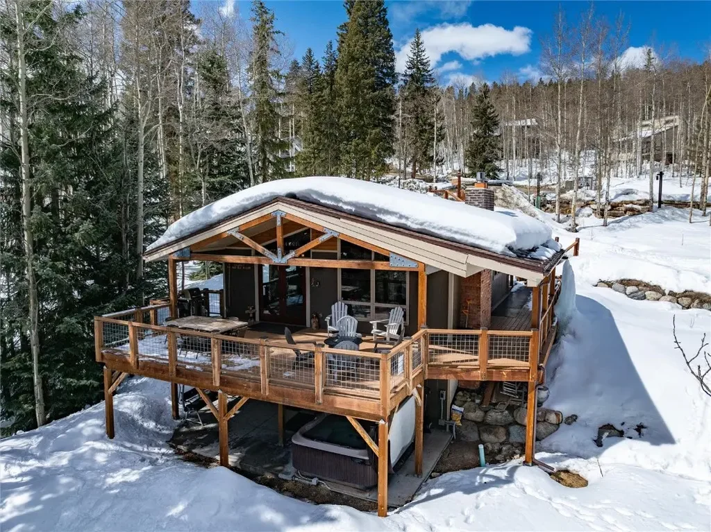 Never before on the market is a true hidden gem located in the quiet Peak 7 neighborhood. Breckenridge world class skiing is only 1 mile away. This quaint and cozy 3 bedroom, 2 bath home sits on a ½ acre of mature pines and aspens on a quiet cul-de-sac and backs the incredible 400 acre cucumber gulch wildlife preserve. The newly remodeled kitchen, master bath, flooring and brand new very large deck offer prime views of Baldy Mountain. This home comes fully furnished and is turn-key ready. The “cabin” has been privately owned by one family since 1978 and multiple generations have shared fond memories for decades. The main level includes and open/vaulted living room, kitchen and dining area with double French doors opening to an expansive view on the expansive deck. Enjoy the lower level walk out patio, hot tub and fire pit after a long day on the slopes. Multiple trails systems for biking, hiking and cross-country skiing surround the Peak 7 Neighborhood making it an outdoor lover’s dream. This charming property offers the perfect blend of comfort, convenience and natural beauty.