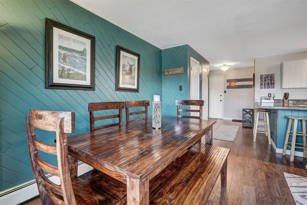 This condo is charmingly decorated and well-appointed. Dillon Valley is centrally located to all ski resorts and just over a mile to Lake Dillon. During the summer, enjoy easy access to the Dillon amphitheater, marina, picnic area, restaurants, Blue River trout fishing and bike trails. During the winter, six ski resorts and other fun winter activities such as the Frisco tubing park, snowshoeing and the classic Rocky Mountains are in your backyard. The entire 1007 square foot unit is located on the main floor, no stairs. Open kitchen, dining area and living room that leads out to the balcony with mountain views await you. The dining table seats 6 there is also a breakfast bar for additional seating. Large leather sofa reclines on both ends for relaxation or napping. Perfect for a family vacation, girl’s weekend, or guy’s fishing trip…this condo has everything you need to relax and enjoy the beautiful Rocky Mountain atmosphere while feeling like you are at home. Close to the club house that has pool and hot tub. On the bus line so you can be anywhere in Summit County in a short amount of time. Less than 1.5 hours from the west side of Denver. This condo will make a perfect mountain retreat/2nd home, long term rental or a combination of these. Can't beat the location.