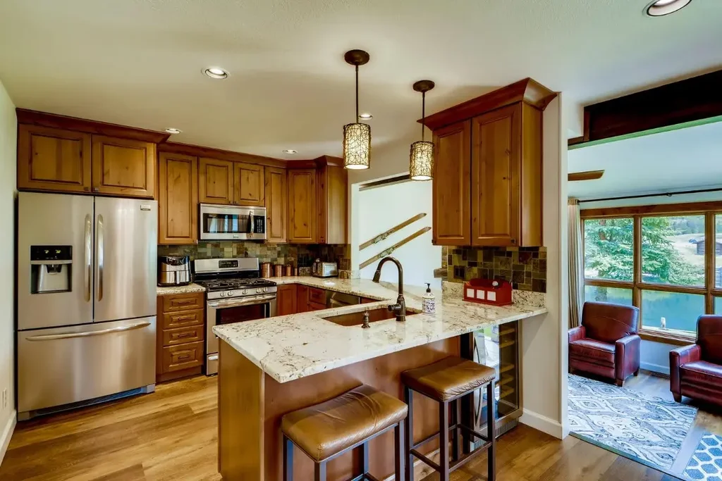 This end unit townhome is the ultimate in resort living with stunning views of the 10-mile range, Crystal Peak, A-Lift Runs at Copper Mountain, and the 11th hole of the Copper Creek Golf Course! Enjoy your beautiful deck with no fear of being hit by golf balls since the Copper Creek Pond separates you from the 11th hole tee box! One of the rare opportunities to live on the water in Copper. The townhome is south-facing with floor-to-ceiling windows that flood the home with sunshine! This unit is completely updated and has 3 bedrooms/2 bathrooms and a large, 1-car garage! This location provides the peace and quiet of a neighborhood while also being convenient to everything Copper has to offer. If you prefer to enjoy your time skiing, the Superbee chairlift is a short 5-minute walk or you can call the free Copper Coach (an on-call homeowner perk) to take you anywhere in Copper. Groomed cross-country trails are also located out the back door on the Copper Creek Golf Course during the winter or take the free Copper Coach to West Village and enjoy miles of groomed trails off Vail Pass. The tubing hill is also conveniently located in East Village or you can take the Copper Coach and enjoy the Athletic Club, the Woodward Barn, ice skating or skinning up the mountain. During the summer, the townhome is conveniently located on the free bike path system that connects Vail, Frisco, and Breckenridge. The Golf Course is right in our backyard or you can enjoy pickleball and tennis a short walk up the street. Frisbee golf is also located within walking distance or you can enjoy all of the summer activities in Center Village, which include: mountain biking, fishing, bumper boats, hiking, go-karts, mountain coaster rides down the mountain, etc. The free Summit Stage stop is across the street and makes a quick trip to Frisco a breeze.