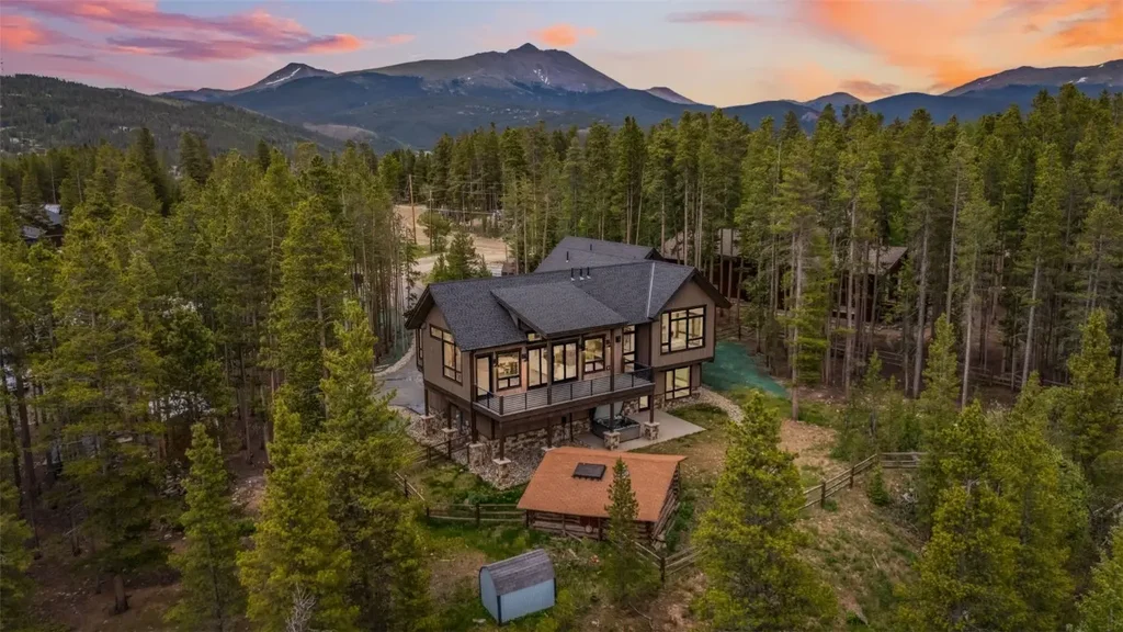 Introducing a newly completed luxury mountain retreat in the heart of Breckenridge, designed by acclaimed local architect Mark Provino and built by Alpha Construction. Situated on a private 1-acre lot, this stunning 6-bedroom, 5-bathroom home captures breathtaking, panoramic views of the Ten Mile Range. Attention to detail at every turn —from vaulted ceilings and stone fireplaces to custom iron railings and expansive floor-to-ceiling windows. The heart of the home is a chef’s dream kitchen, centered around a massive island ideal for entertaining. Step outside to an oversized and partially covered deck that invites you to soak in the alpine views or host sunset gatherings. The spacious family room offers a wet bar and ample space for media, gaming, or relaxation. The authentic historic log cabin in the yard is ready to be transformed into a charming office or creative space. Additional modern amenities include three EV charger points, two in the garage and one for the car port, and generator hookup. With access to the nearby Iowa Hill Trailhead and a short walk to restaurants and bars of Airport Road, this home offers the perfect balance of seclusion and convenience. Constructed in two stages between 2021 and 2024, it’s the ultimate expression of mountain luxury living.
