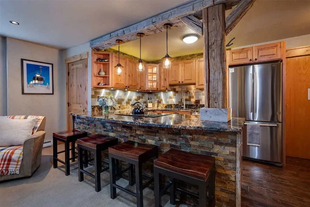 Ski-In/Ski-Out in the Green Zone! This beautifully remodeled 1-bedroom condo in Storm Meadows offers the truly unique feature of direct access to the slopes right from your private deck. Nestled slopeside in Steamboat’s world-famous ski resort, this residence combines mountain charm with high-end finishes. Step inside to find warm wood flooring, rustic barn-wood accents, and a striking oversized barn door that sets the tone for the space. The fireplace showcases a dry stack surround and wood beam mantle that echoes the design of the kitchen island, creating a seamless, cozy aesthetic. The kitchen is equipped with custom cabinetry featuring uplighting, under & in-cabinet lighting, granite slab counters with hand-crafted edging, a tasteful backsplash, and quality stainless appliances. The bathroom impresses with custom tiles featuring detailed insets and a vestal bowl sink. Throughout the condo, faux finish walls pair with barn-wood features to create a welcoming, cabin-inspired atmosphere. Updated lighting and ceiling fans complete the ambiance. Storm Meadows East Building offers the most accessible ski in/Ski out experience within the community, located directly off the Right-O-Way run. Other features include parking, ski storage, an elevator, community hot tub and a fire pit to sit with friends and watch everyone ski by! Walk to the Mountain Village to access restaurants, shops, free concerts and so many hiking & biking trails in the summer months. Here you can also access the Free Bus taking you all the way into Downtown. This is slope-side living elevated — Offered fully furnished with an impressive rental history & income potential.